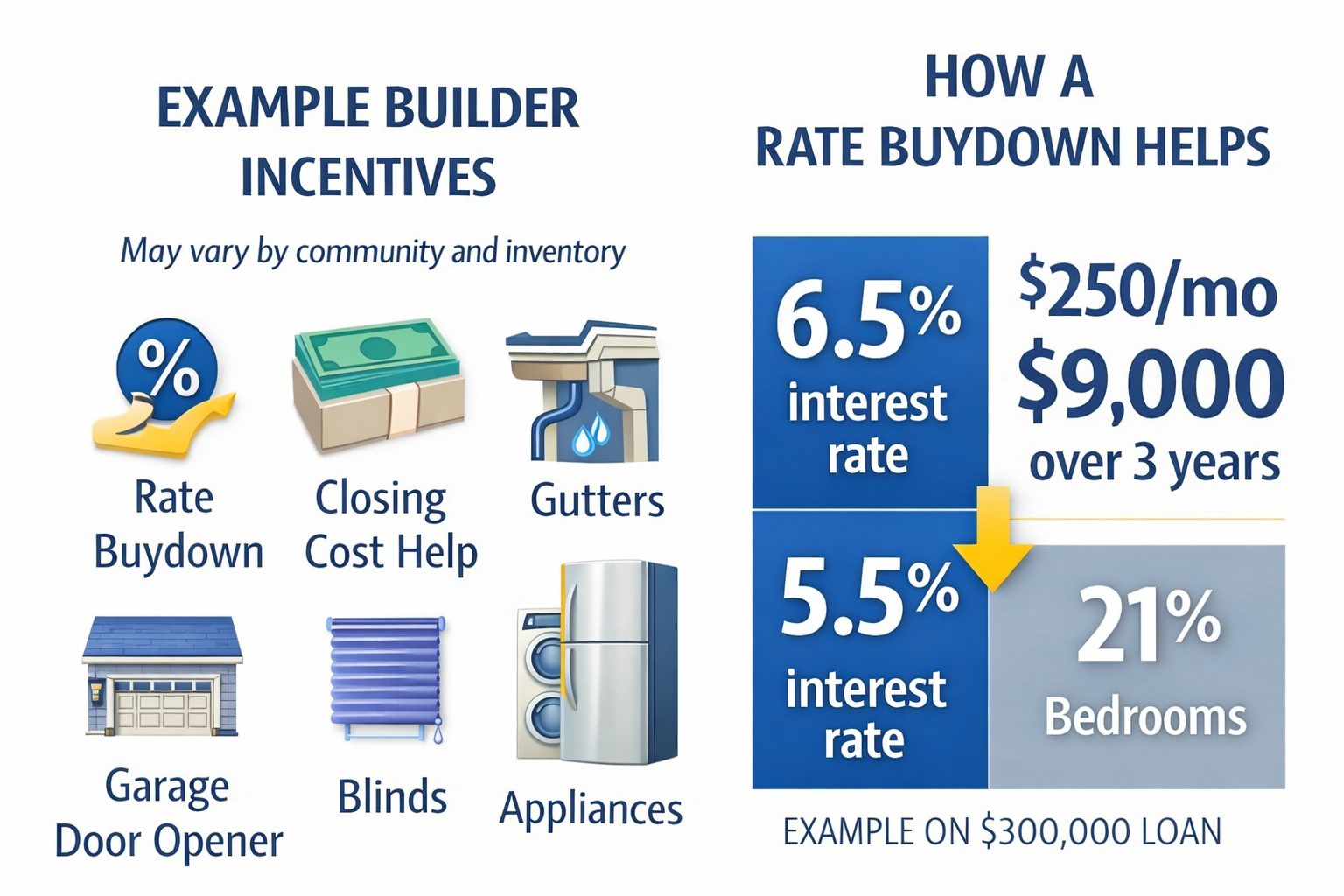 The key is that these incentives vary by builder, by community, and sometimes even by specific home. They are also subject to change.